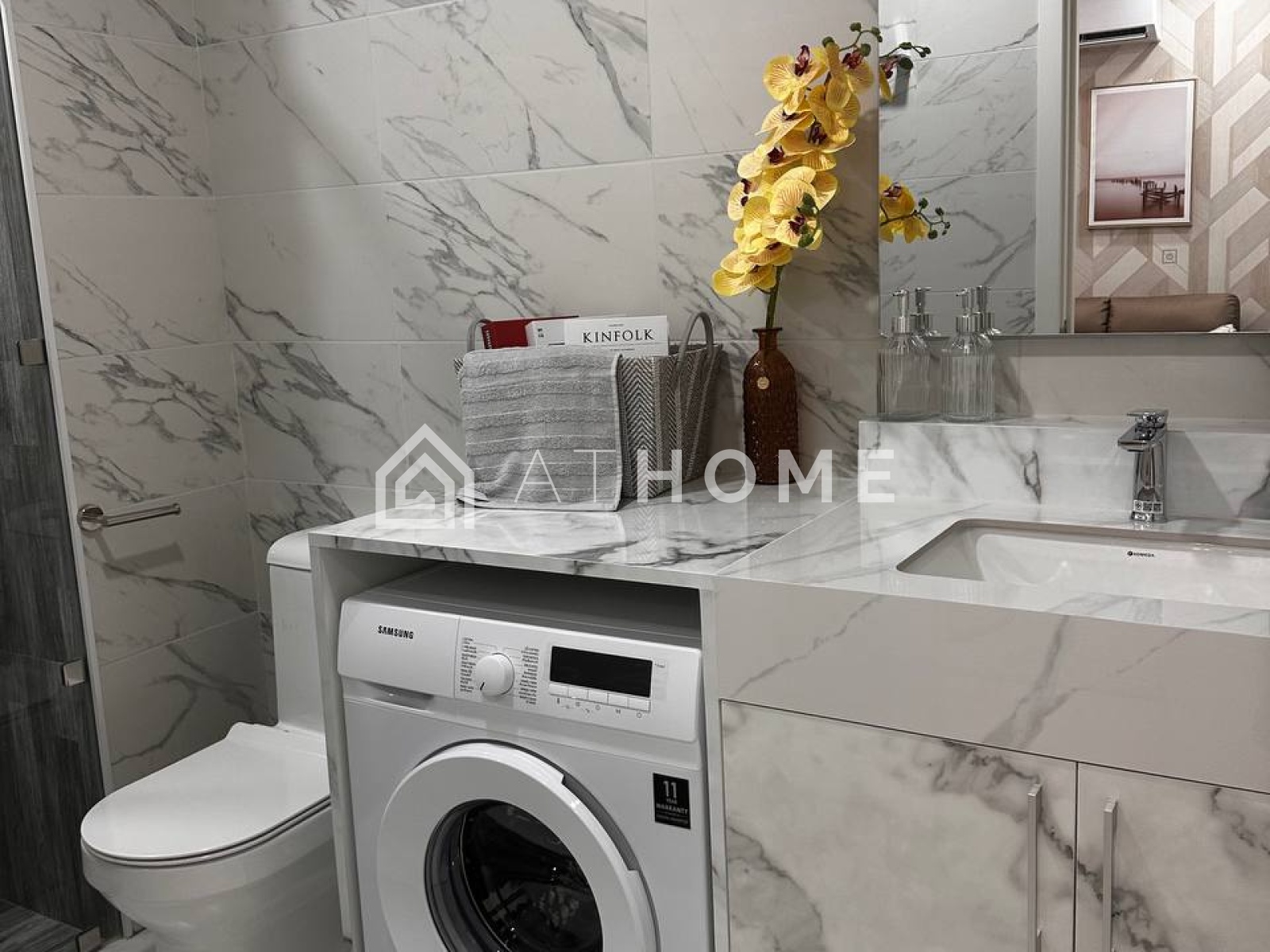 Residents have access to a rooftop swimming pool with sea views, a fitness room, Finnish sauna, underground parking, reception desk, 24/7 security and CCTV. The building features an elevator, Wi-Fi, and a backup generator. There are commercial spaces on the ground floor.