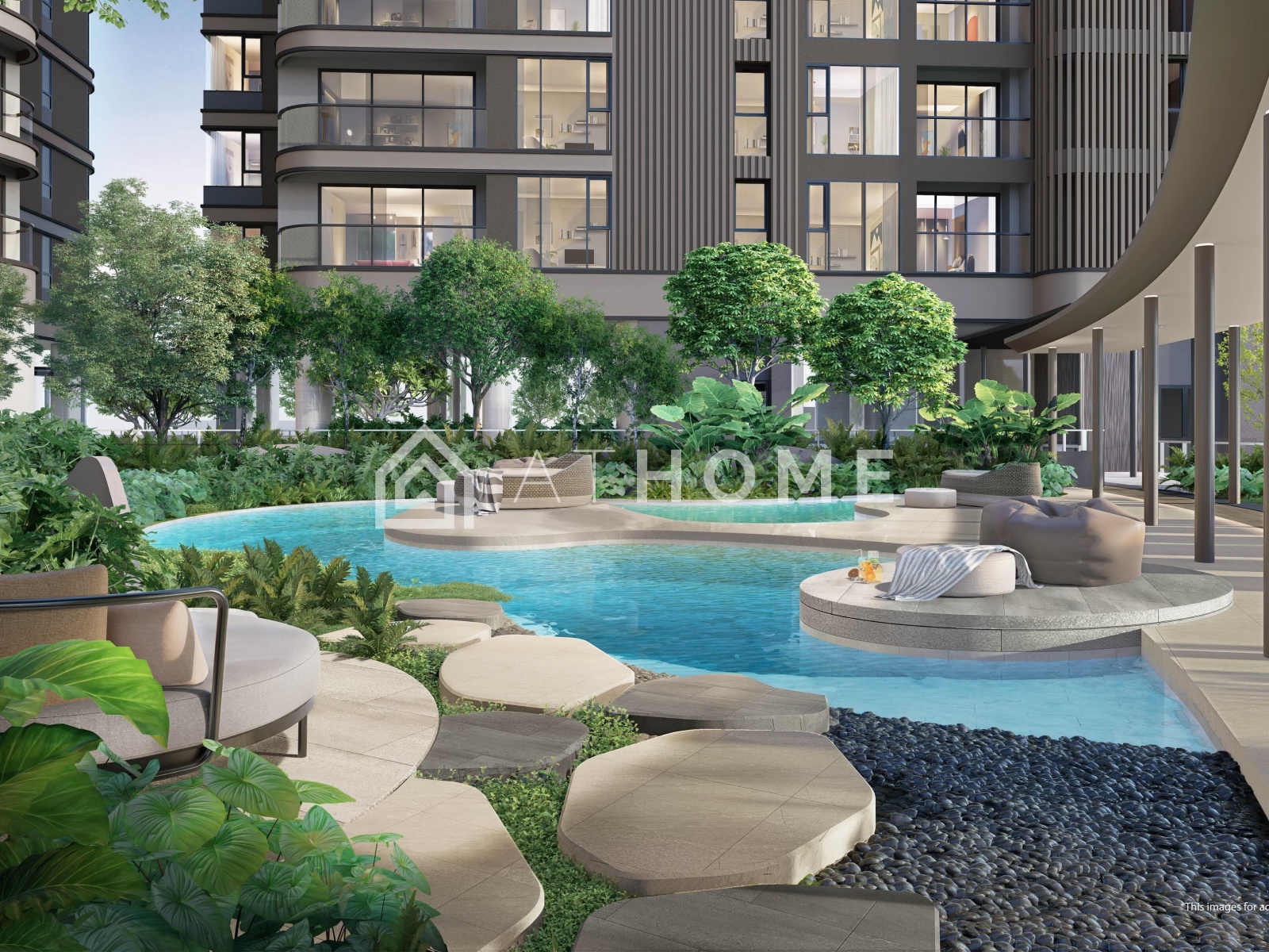 Residents can enjoy a resort-style pool, modern fitness center, sauna, reception area, 24/7 security, parking, and video surveillance. The territory is filled with tropical greenery and lounge areas, creating a relaxed and private atmosphere.