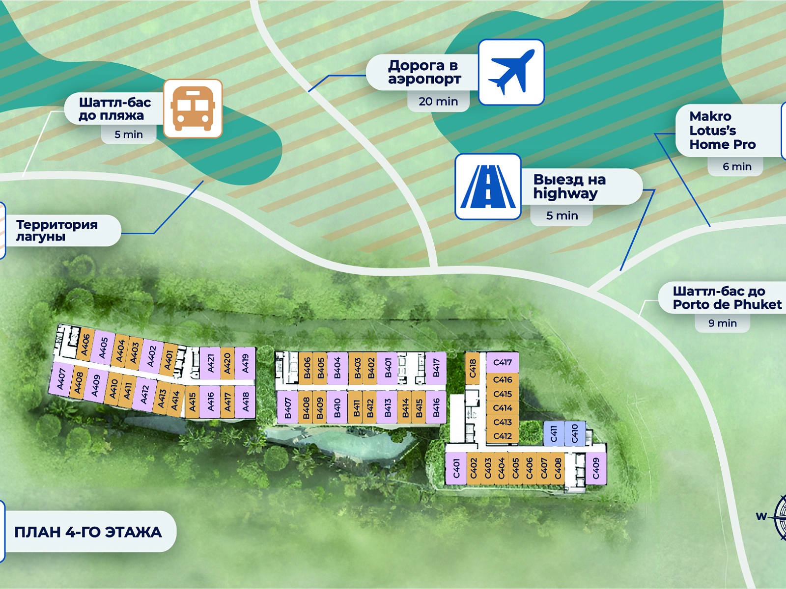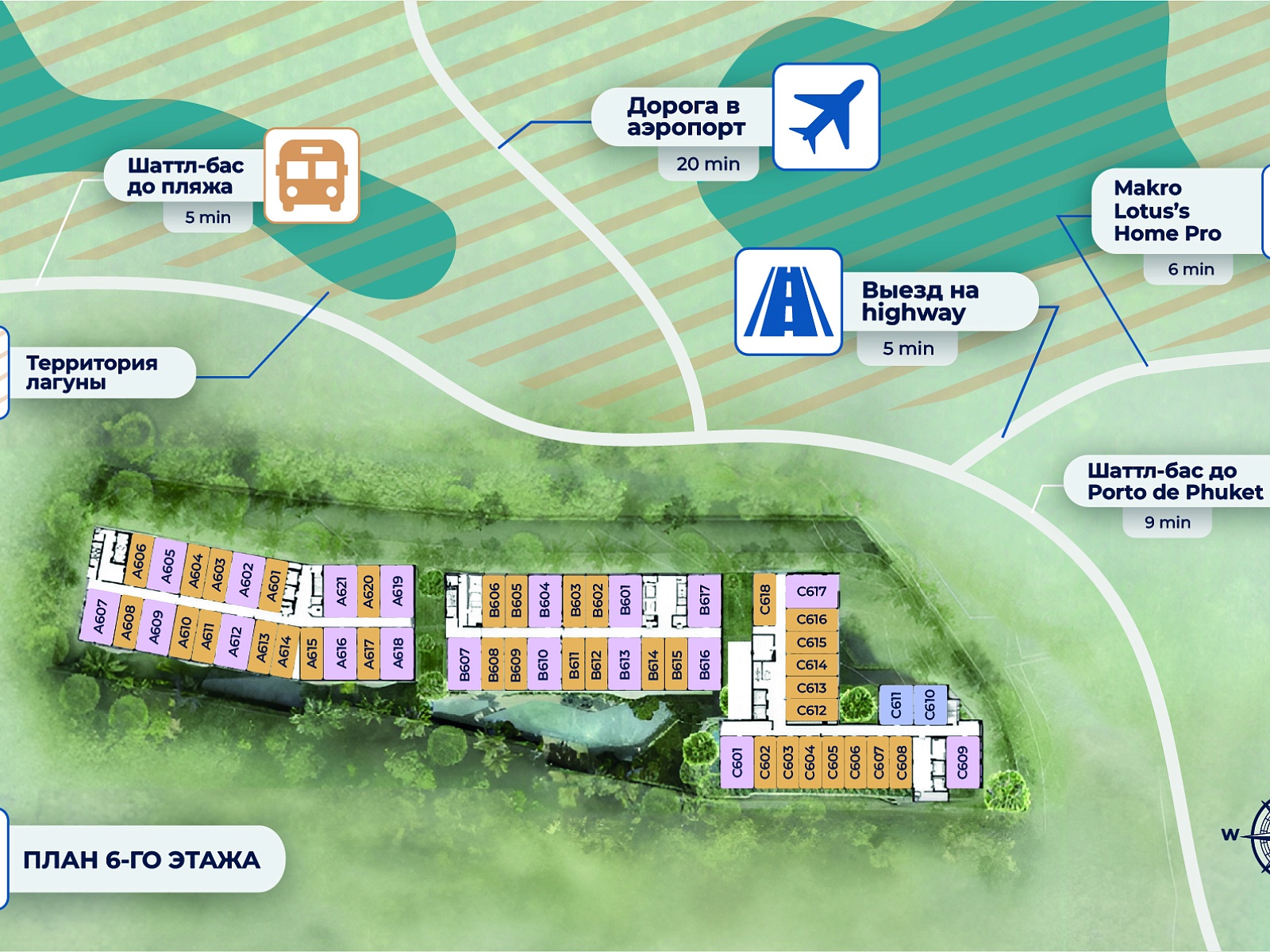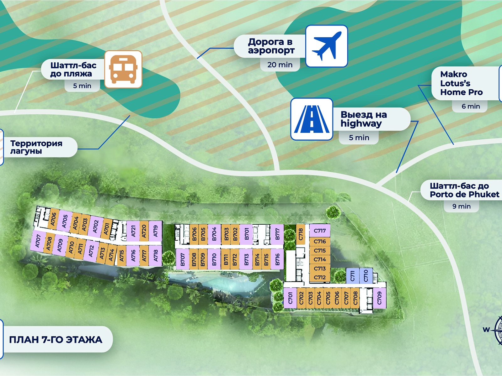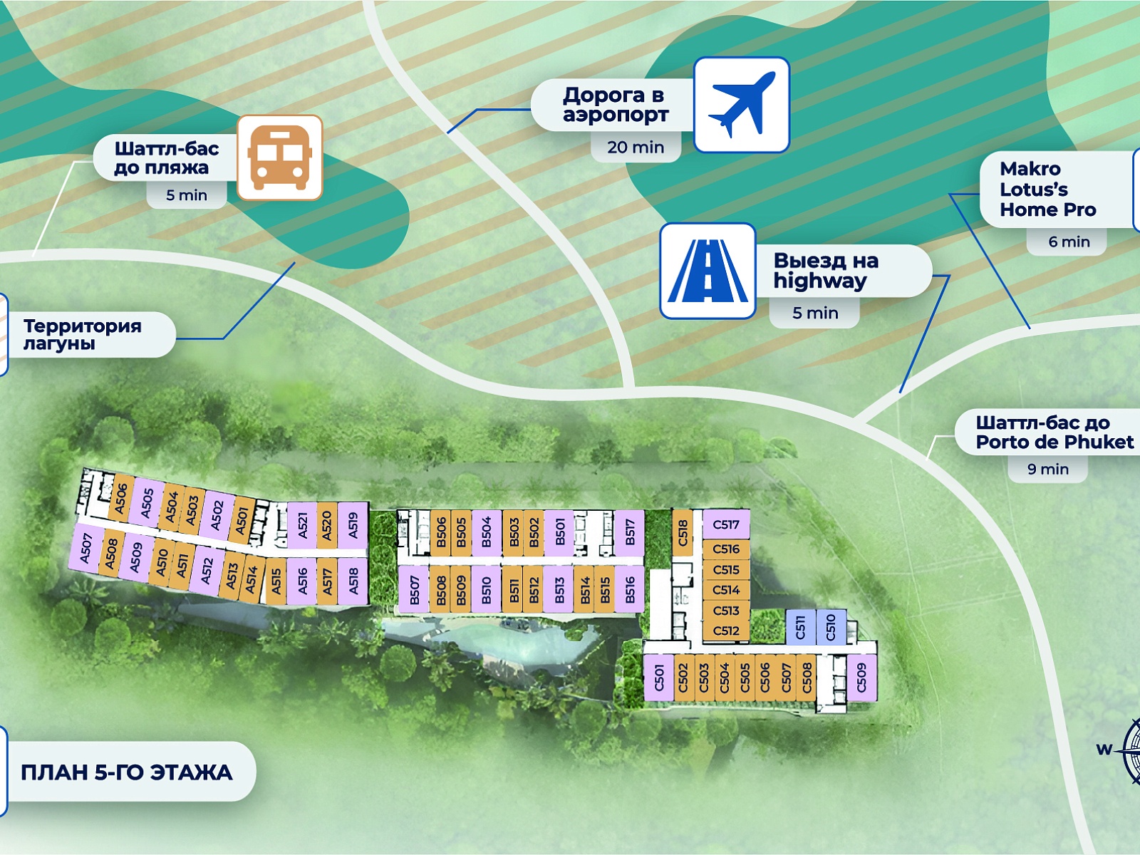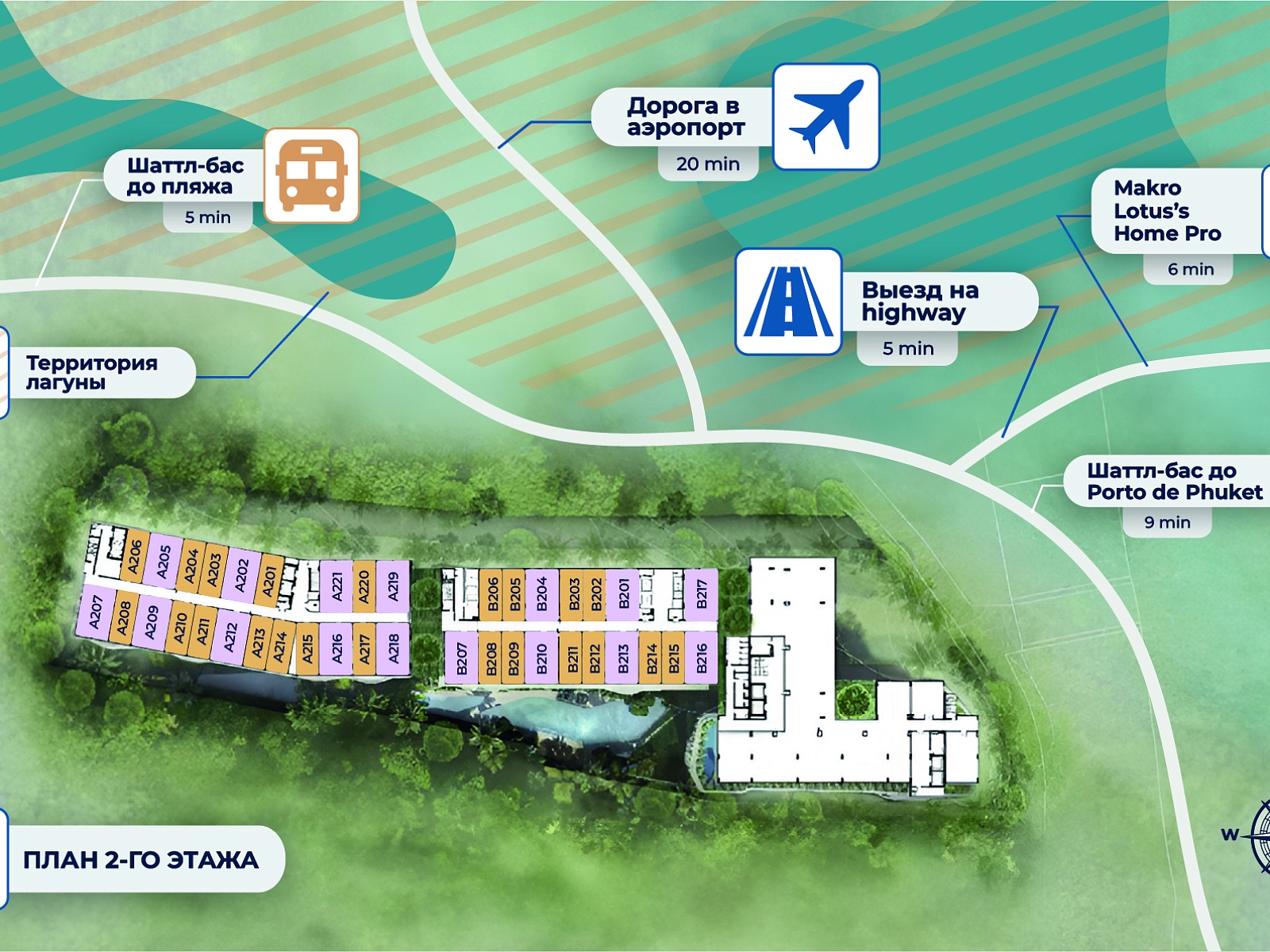 The project is located in Bang Tao — one of Phuket’s most desirable areas, home to Laguna Phuket, Porto de Phuket, and Boat Avenue. White sandy beaches, fine restaurants, shopping malls, international schools, and fitness centers are all nearby. The airport is about 25 minutes away by car.