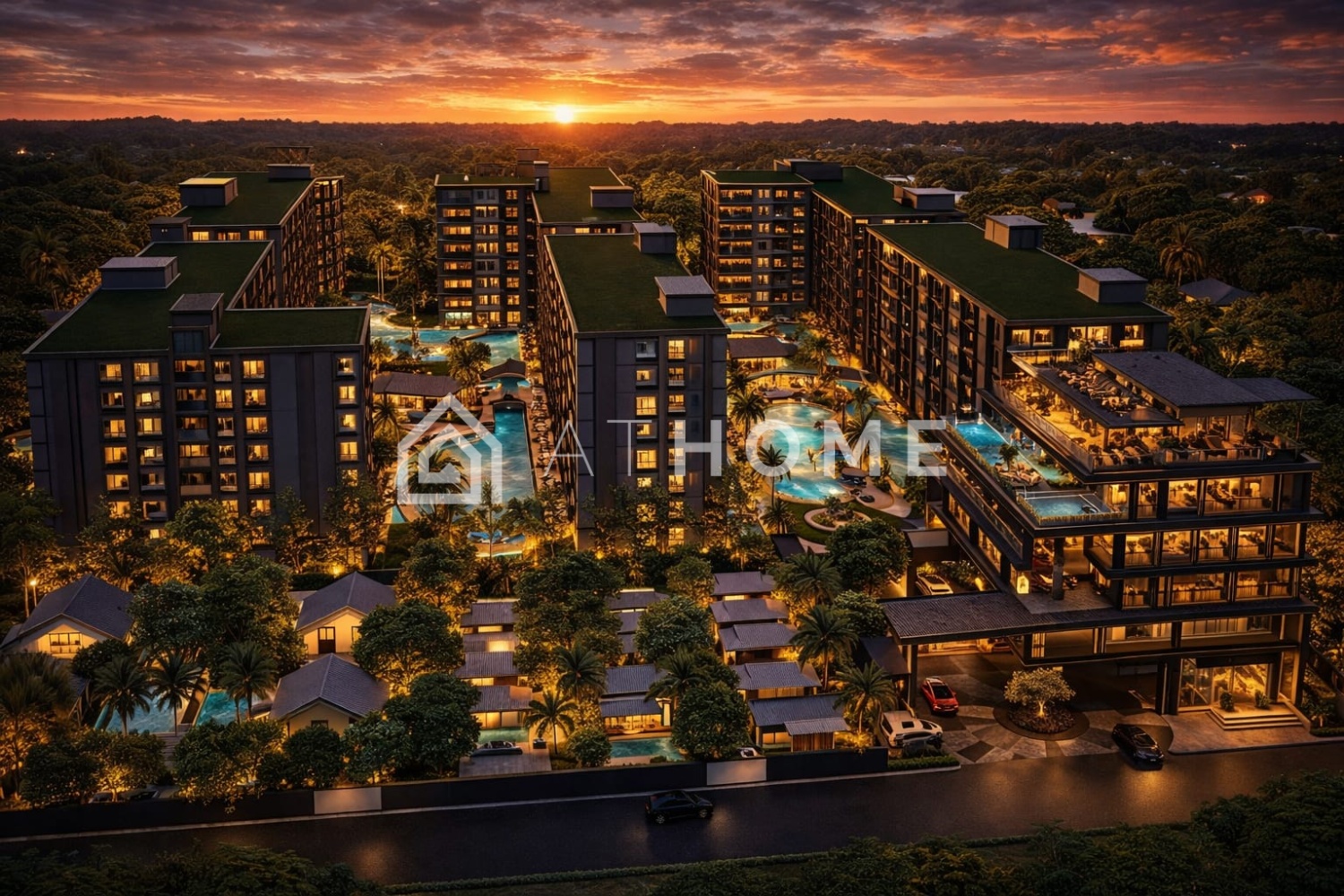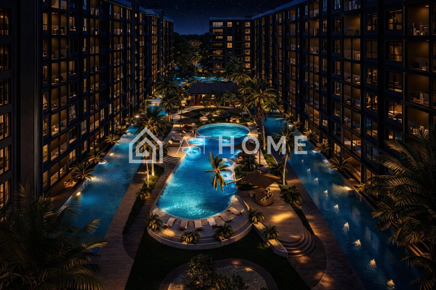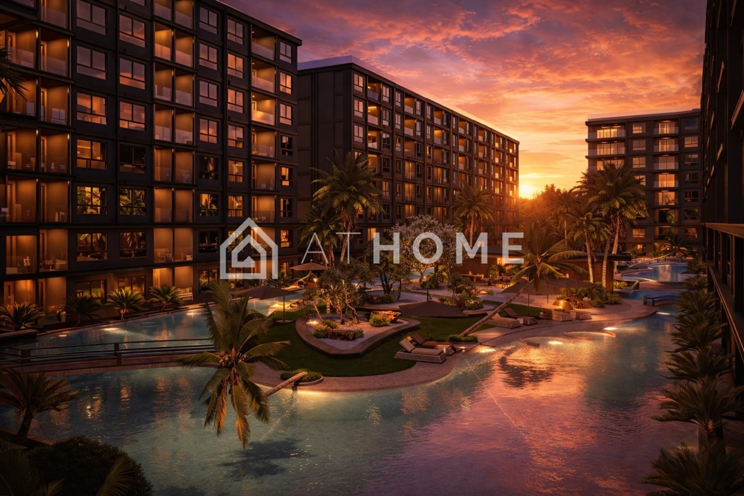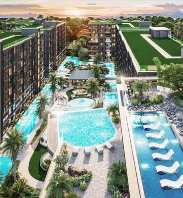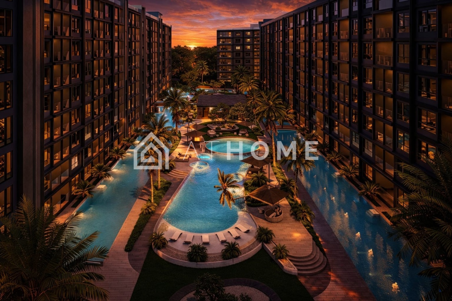 Set within a private 12-Rai (19,200 sqm) master-planned estate, the development comprises six elegant 8-storey buildings with over 900 refined apartments. More than 70% of units enjoy panoramic views across flowing lagoon pools and Zen-inspired landscaped gardens. The architecture reflects Japanese principles of harmony and tranquility, creating a true resort-style sanctuary.