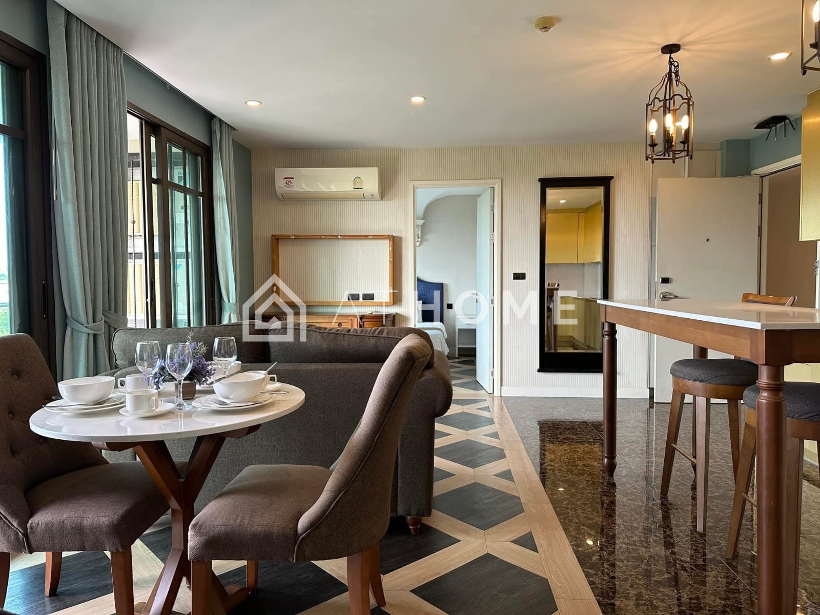 Квартиры полностью меблированы и готовы к проживанию. В отделке использованы светлые тона, керамическая плитка, декоративная лепнина и элементы испанского декора.