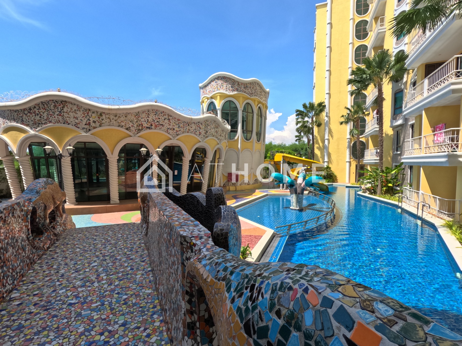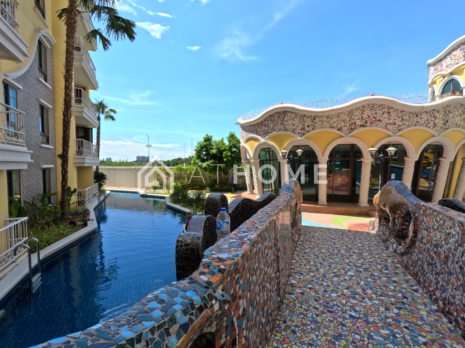 Espana Condo Resort впечатляет масштабной инфраструктурой курортного типа. В распоряжении жильцов — огромный открытый бассейн в форме лагуны, водопады, мостики, декоративные башни и фонтаны, создающие атмосферу европейского курорта.