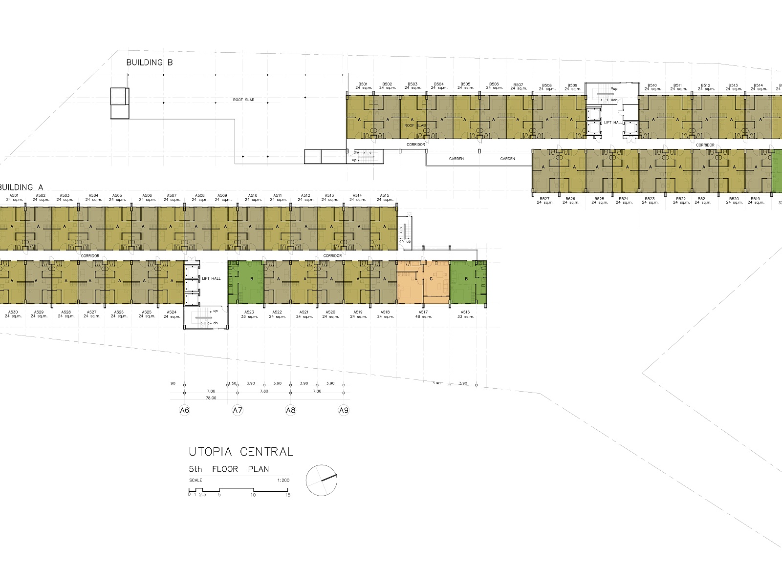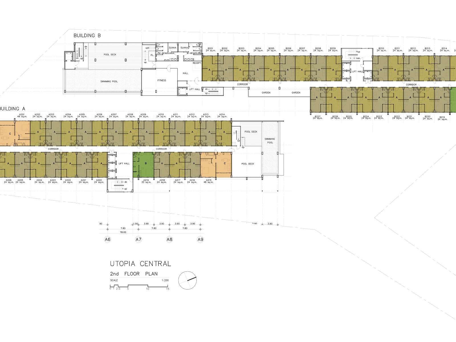 Utopia Central состоит из двух 8-этажных зданий и включает 405 апартаментов. В проекте представлены студии и квартиры с 1–2 спальнями. Интерьеры выполнены в современном минималистичном стиле с акцентом на свет и простор. Основная идея проекта — соединение городской динамики с уютом и атмосферой курортного жилья.