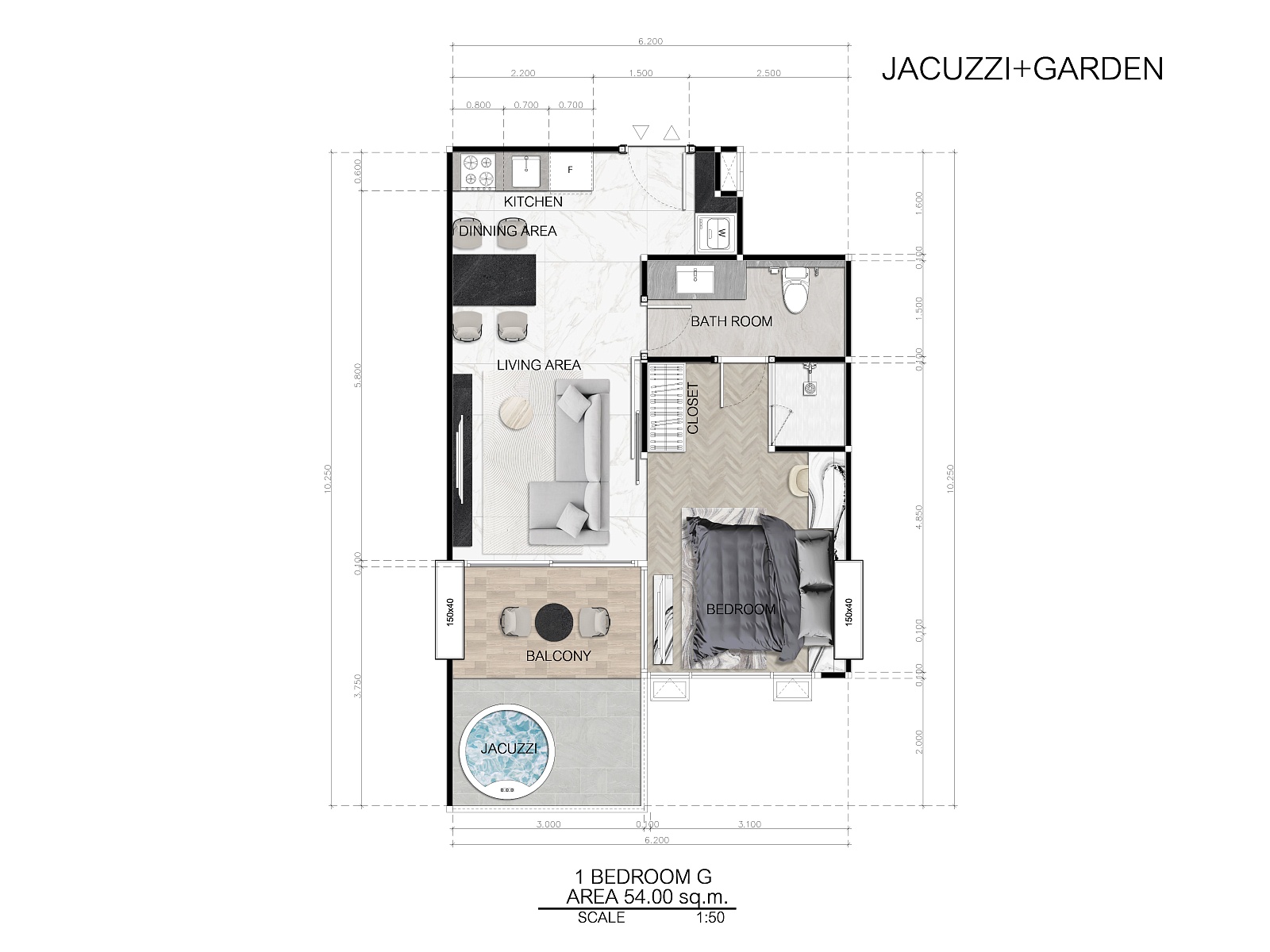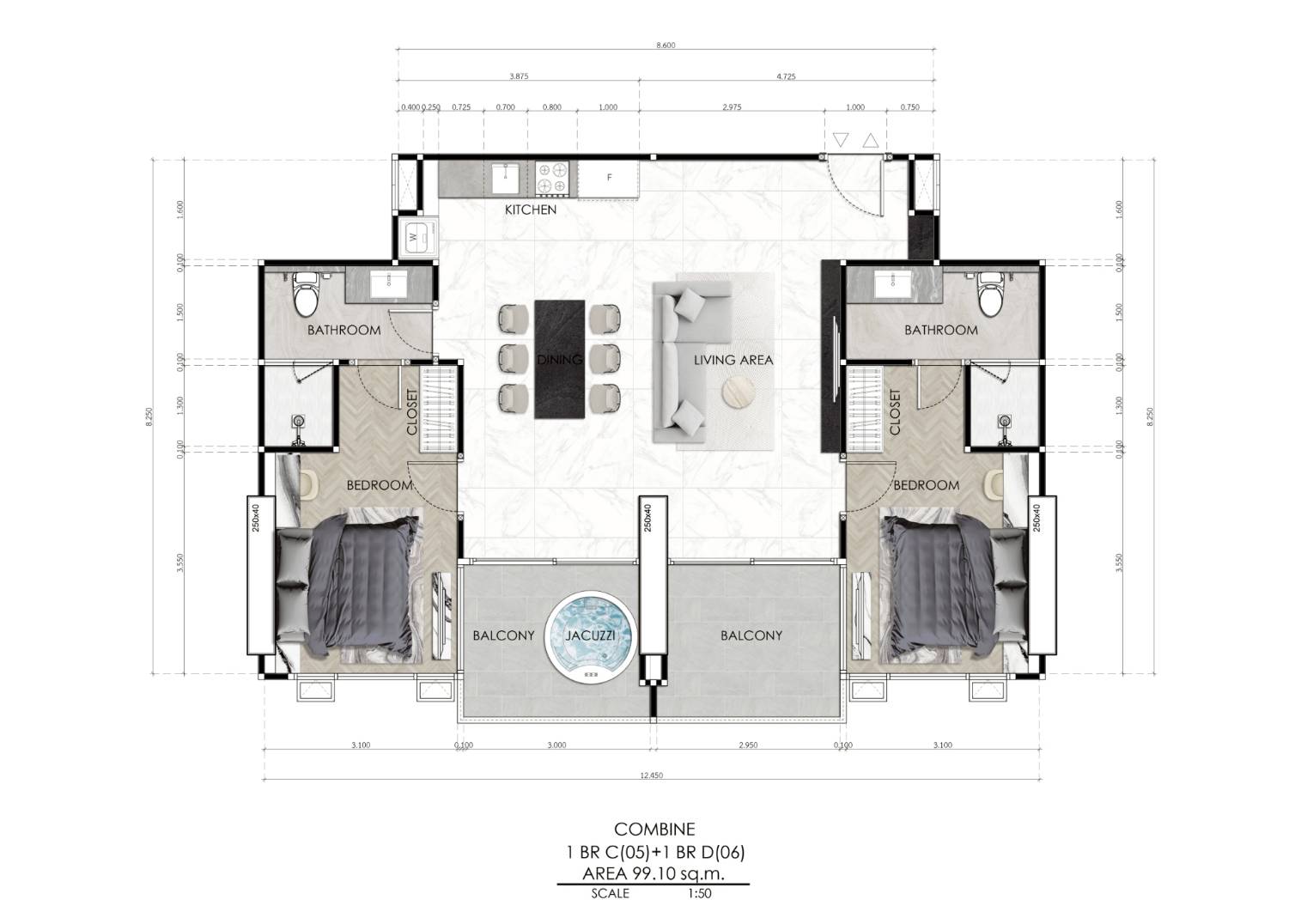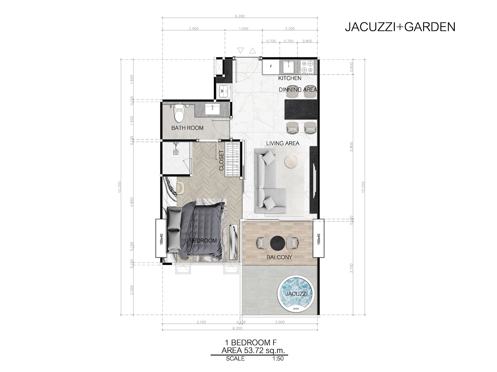Первая линия пляжа Джомтьен: прямой доступ к набережной, рядом — кафе и рестораны, рынки свежих морепродуктов, 7-Eleven, остановки тук-туков и вся туристическая инфраструктура южной Паттайи. Удобная развязка к Thappraya Rd и Sukhumvit Rd обеспечивает быстрый проезд в центр города, на Пратамнак и в район На-Джомтьен.
