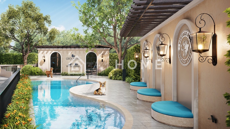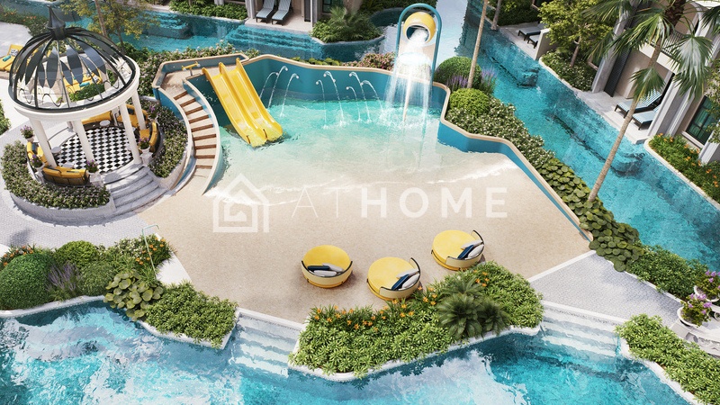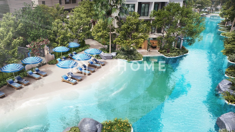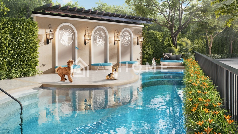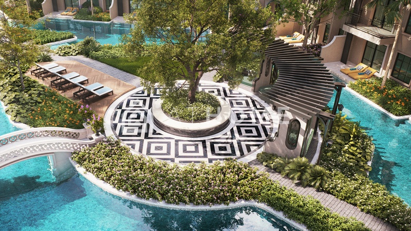 - Открытые зоны: бассейн The Sunset Beach, Indigo Oasis с дизайнерской водой, прогулочная аллея Mediterranean Promenade, зоны для питомцев, садовые островки, Blue Grotto Escape.